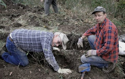Medlemmar av Östgotiska Klubben (den så kallade Östgötaskolans arkeologiska gren) kommer under sommaren 2010 att fortsätta utgrävningen av den östgotiska bosättningen i Hjulsbro. Det politiskt korrekta, akademiska etablissemanget har naturligtvis inte visat något som helst intresse för de sensationella fynd som gjorts här sedan slutet av 1960-talet.. På bilden ser vi Bengt Fram och Didrik Ögnelood i färd med att undersöka en stormansgrav.